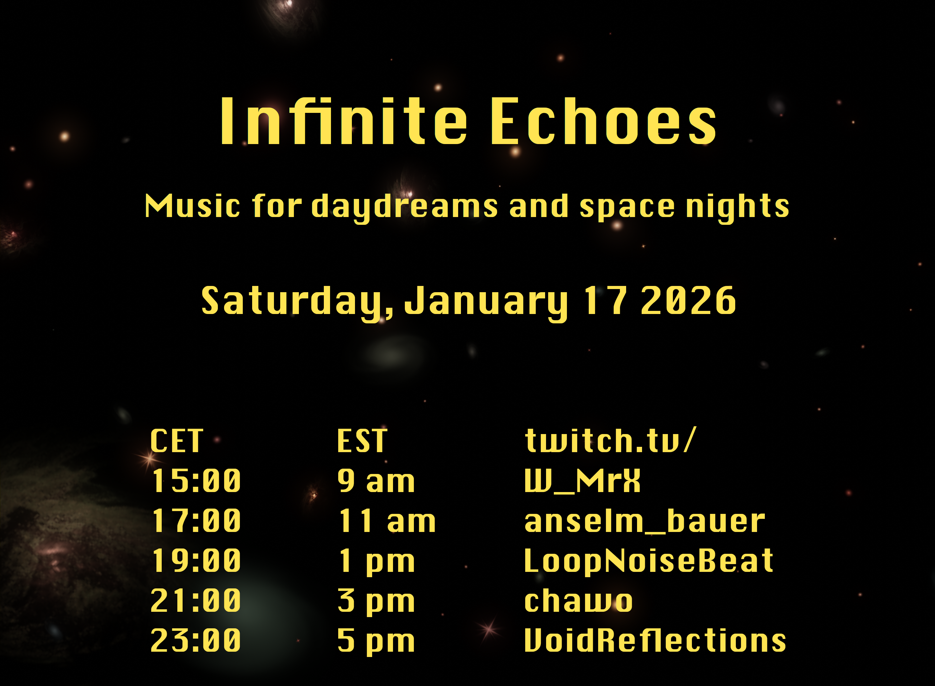 Saturday, January 17 2026: Infinite Echoes with special guest Anselm Bauer live on #Twitch!