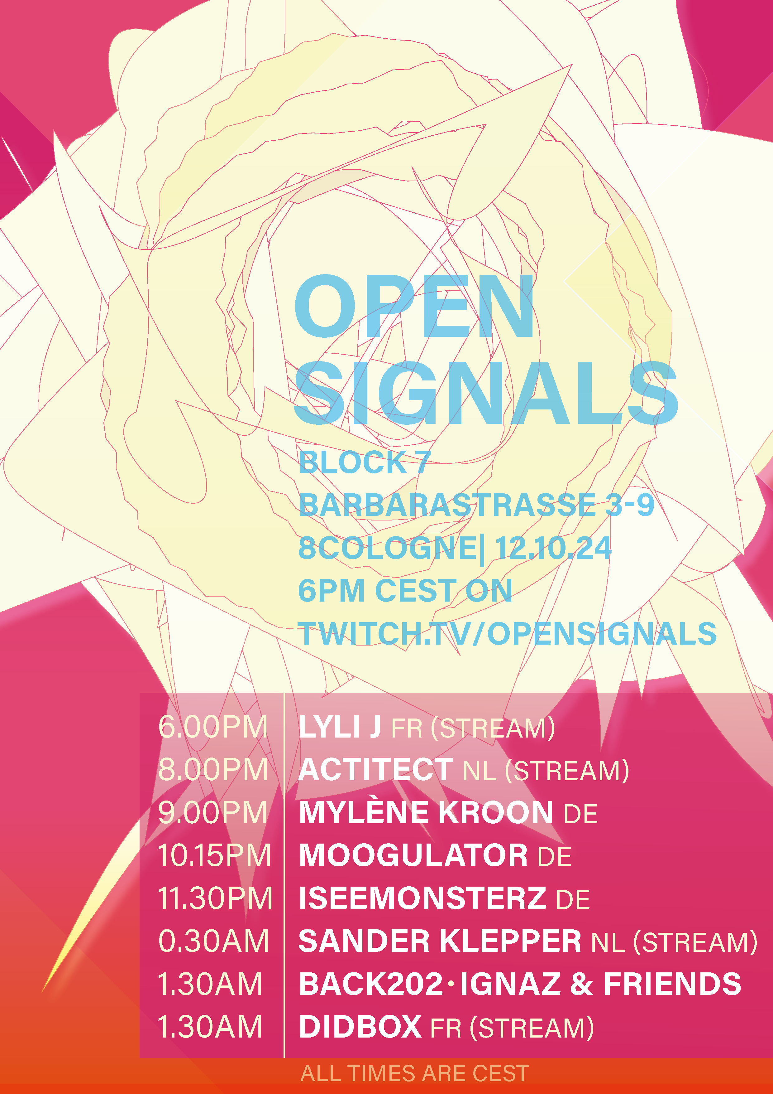 Open Signals #4 - Open Signals cordially invites you to an evening of innovative electronic music featuring live performances and online streams. On October 12 2024 at 8 p.m., four performances will take place in a diverse spectrum of experimental sounds, from ambient to danceable beats. The journey begins with a stream from Actitect live from Amsterdam, followed by performances by Mylène Kroon and